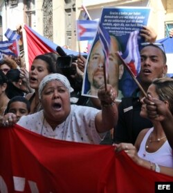 impatizantes del Gobierno cubano gritan consignas revolucionarias mientras el grupo de mujeres Las Damas de Blanco.